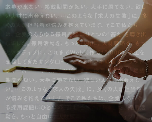 一言でいえば「掲載期間を気にする必要のない採用サイトで、ベストマッチの人材採用を叶えるサービス」です。最高クオリティの採用サイトと、どこより使いやすい管理システムで採用活動を徹底サポート。さらにサービス自体が“世界No.1の求人市場に向けて、効果的な求人を発信する”仕組みになっているため、本当に会社にマッチした「逸材(=辞めない人材)」を採用できる確率もグッと高まります。